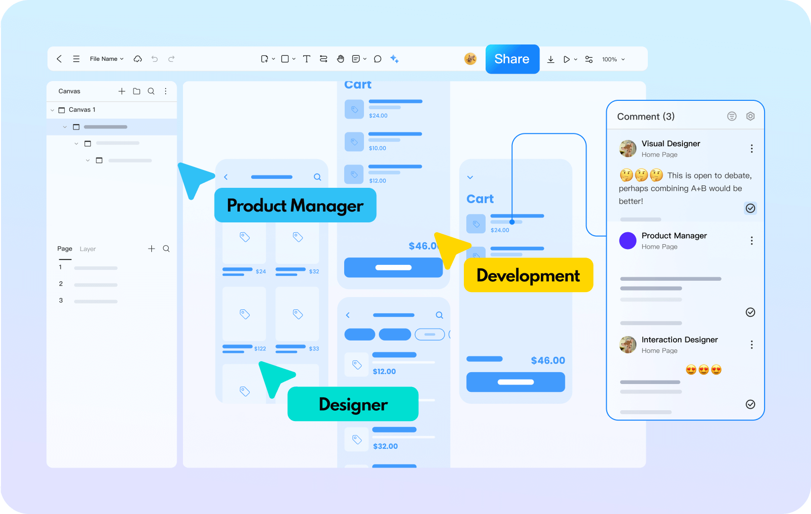Sketch has limitations in version management and in combing files, the number of canvases, the number of pages, etc., which can easily lead to version loss, file loss, and other problems